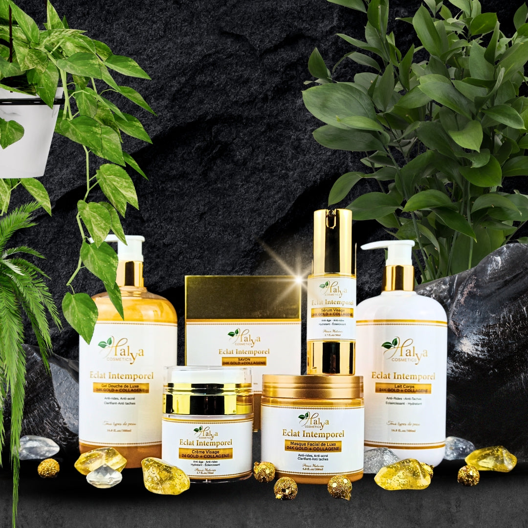 Votre peau mérite ce qu’il y a de plus précieux. Avec la Gamme Éclat Intemporel, Halya Cosmetics réinvente le soin anti-âge grâce à une formule luxueuse enrichie en 24K Gold, Collagène, Ginseng et Magnésium.